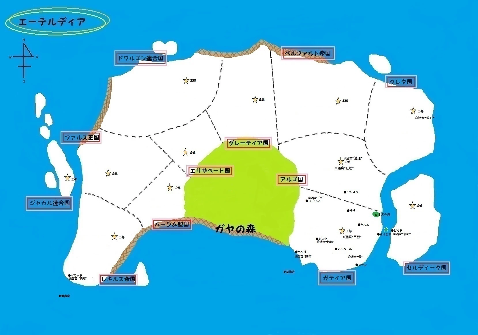 All of these nations skirt the southeast, east, northeast, north, northwest, west, and southwest edges of Etelldia, with the innermost of them surrounding the Forest of Gaia.